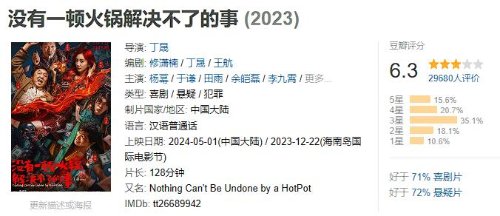 豆瓣App显示,《没有一顿火锅解决不了的事》目前收录2.9万名观众评分,,总评分为6.3分,在五一档电影中位列倒数。