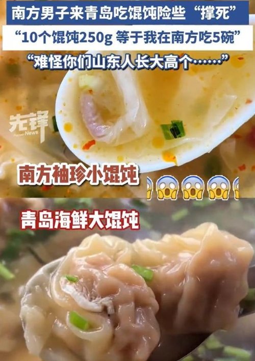 对此,网友纷纷表示:“南方有大馄饨和小馄饨,这里面展示的是小馄饨”“最爱吃的就是馄饨了,那种特别大的馄饨”“山东的饼,馒头,葱,饺子,哪个量不大,人的个头都是xxxxl”。