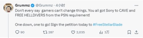 因此,这段时间一直在和索尼对着干(发起请愿回滚《剑星》版本)的前《魔兽世界》制作人Grummz也发推庆贺道:谁说玩家们不能成事?你们成功地让索尼让步,解除了《地狱潜兵》对PSN的要求!一个目标完成了,还有一个要做!今天就签署请愿书,支持解放《剑星》!