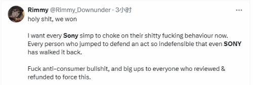 玩家们纷纷发文庆祝,称在这场玩家和索尼的战争中获得了胜利。