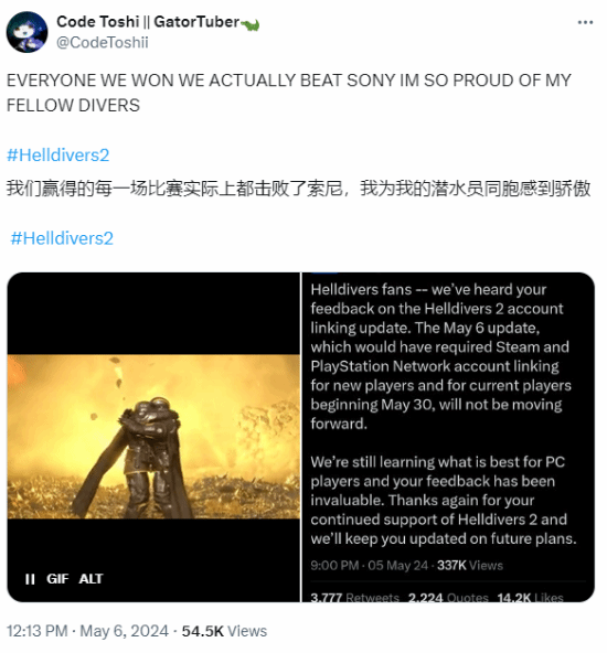 今日,索尼终于对《地狱潜者2》强制绑定PSN作出回应,表示不会推出该更新。在这之后,网友们纷纷发文庆祝此次胜利,感谢玩家们的共同努力。