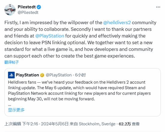 Pilestedt表示:“《地狱潜者2》社区玩家们的意志力和协作能力给我留下了深刻的印象,其次我要感谢我们在PlayStation的合作伙伴,他们迅速且有效的做出了让《地狱潜者2》绑定PSN成为让玩家可自选的决定。我们(箭头与索尼)也共同希望能够与开发者和社区一起,为实时型游戏的最佳游戏体验设定一个新标准。”