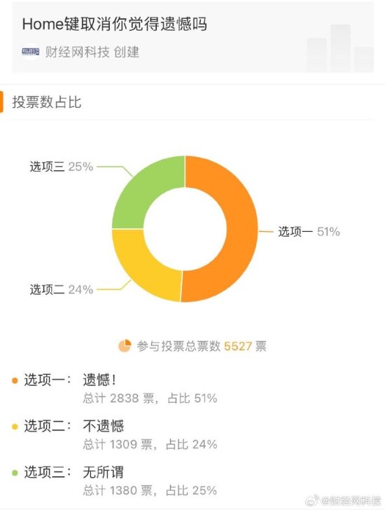 在“Home键取消你觉得遗憾吗”议题投票中,51%的网友认为取消home键很遗憾,24%网友认为不遗憾。