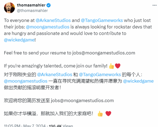 此外,他也向被关闭工作室的员工伸出了橄榄枝,邀请他们申请在Moon Studios的职位。