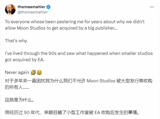 他表示,这就是自己不允许Moon Studios被大型发行商收购的原因,自己经历过90年代,亲眼目睹了小型工作室被EA收购后发生的事情,所以他们不会做同样的事情。