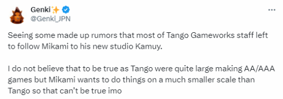 目前看来,多数网友对该消息的真实性表示怀疑。知名游戏推主Genki指出,Tango制作的是2A/3A的大型游戏,而三上的新工作室Kamuy目标是小型游戏,因此前者向后者跳槽的可能性很小。知情人士称三上离开Tango时与微软签了为期1年的竞业条款,这意味着Kamuy成立第一年不会招募太多开发人员吃空饷。
