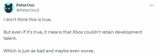 另一位Xbox系推主PeterOvo也认为该传言不可信。同时他也悲观的认为,如果传言是真的,那么微软的处境则更糟糕,因为这代表微软无法留住人才。
