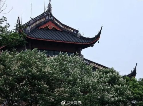 近日,杭州灵隐寺内的七叶树开花了。七叶树被称为佛门圣树之一,花簇远看就像一座座白色的小宝塔。七叶古树植何年,叶叶枝枝翠色鲜。只为昔时受记莂,今来此地荫人天。