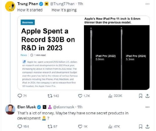 苹果周二发布了新的iPad Air 6和iPad Pro产品,马斯克在回应了X用户“Trung Phan ”的一条帖子,后者发布了一张截图,将苹果2023年高达300亿美元的研发支出与新款11英寸iPad Pro厚度的微小改进进行了比较,讽刺其巨额研发支出与成果不成比例。