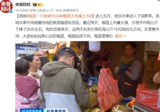 榴莲一斤跌破10元登热搜 云南昆明榴莲大批量上市