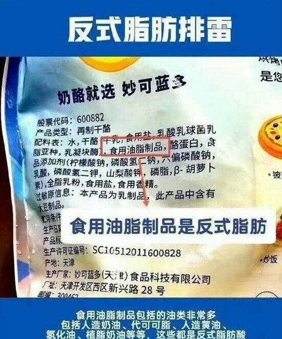 起因是有网友发现,妙可蓝多奶酪制品的配料表中,含有一项名为“食用油脂制品”的成分。该网友认为,这个“化名”的背后,实际成分就是反式脂肪。