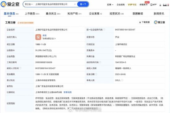 爱企查App显示,妙可蓝多关联公司上海妙可蓝多食品科技股份有限公司成立于1988年11月,法定代表人为柴琇,注册资本约5.1亿元人民币,经营范围包括乳制品生产技术领域内的技术开发、技术咨询、技术服务等。