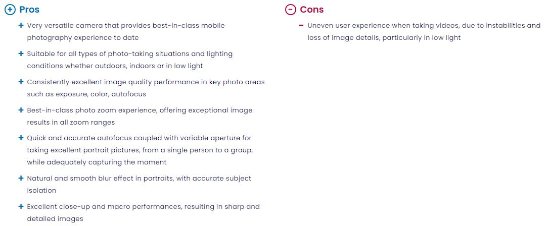 在测试结果中,DXOMARK也列举了这款手机的优缺点。
