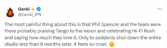 “最令人痛心的是,菲尔·斯宾塞和他的团队当时可能还在那里对Tango的工作赞不绝口,为《完美音浪》欢呼雀跃,说他们有多喜欢这款游戏。但不到8个月后,他们却突然关闭了整个工作室。这太残酷了。”