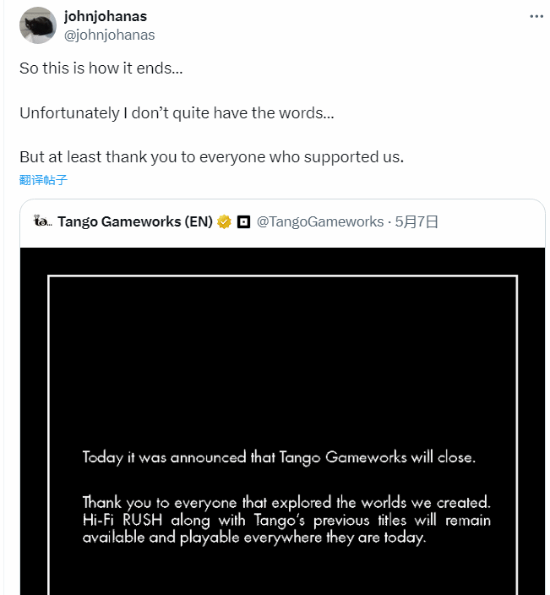 在Tango Gameworks工作室被微软宣布关闭后,其创意总监John Johanas发文:“很遗憾,这就是最后结束的方式,此时此刻我无法用言语来表达我的感受,但至少要感谢所有曾支持我们的人。”