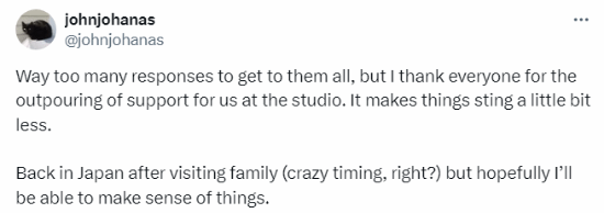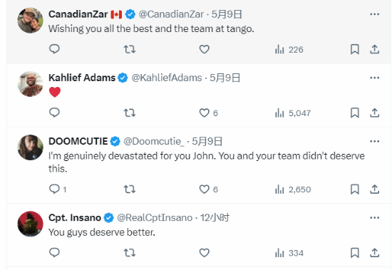 不少玩家纷纷留言鼓励John Johanas走出困境,为Tango工作室其他同胞鸣不平。对此他也发文再次回应:“回复太多了,无法一一回复,但我还是要感谢大家对我们工作室的大力支持,这样我感觉没有那么痛苦了。现在我结束了探亲,但愿我能理清事情的头绪。”