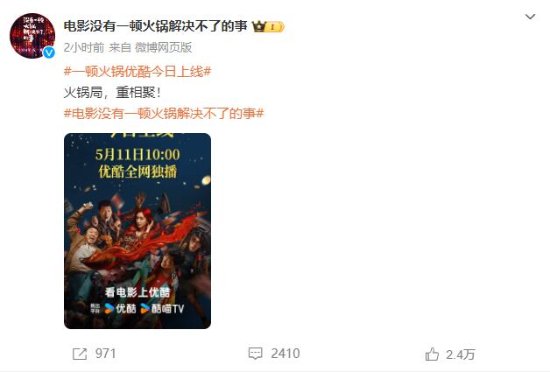 今日,《没有一顿火锅解决不了的事》官方突然宣布本片上线网播,优酷视频全网独播,且会员免费观看,无需额外付费。