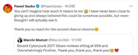 该推文也被《赛博朋克2077》首席设计师Pavel Sasko转发:“你们无法想象这对我来说意味着什么,我从来没有想过放弃,并一直相信这是有可能的,但从未想过我能够真正看到这一点。非常感谢你们给予我第二次机会。”