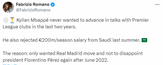 今日,据知名记者罗马诺消息,姆巴佩过去两年里从未想过与英超俱乐部谈判,去年夏天他还拒绝了沙特报价的两亿英镑年薪。原因只有一个:皇马,因为他在2022年夏窗未能转会后不想让皇马主席弗洛伦蒂诺再次失望了。