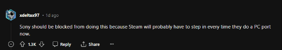 “应该阻止索尼这样做,因为现在每次他们做PC移植时,Steam可能都必须介入监管。”