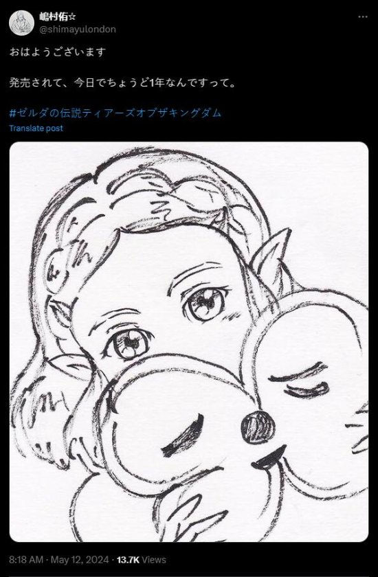 塞尔达公主的声优嶋村侑今日发文,祝贺《塞尔达传说:王国之泪》发售一周年,并分享了一张由自己手绘的塞尔达公主。