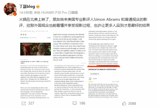 此前《没有一顿火锅解决不了的事》在五一档上映后宣布撤档,并宣布其将会上线网播,优酷视频全网独播,且会员免费观看,无需额外付费。而在昨日晚,导演丁晟在微博总发文分享了一篇电影《没有一顿火锅解决不了的事》北美上映后美国专业影评人和普通观众的影评,并表示:“欣慰外国观众也能看懂并享受观影过程,也许让更多人品到才是最好的结果。”