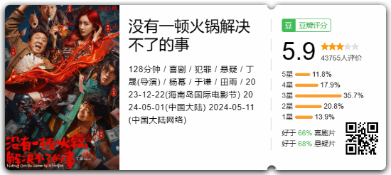 截至发稿前,《没有一顿火锅解决不了的事》在豆瓣中的评分为5.9分,共有43765人参与评价,其中给予3星的人数最多,为35.7%。