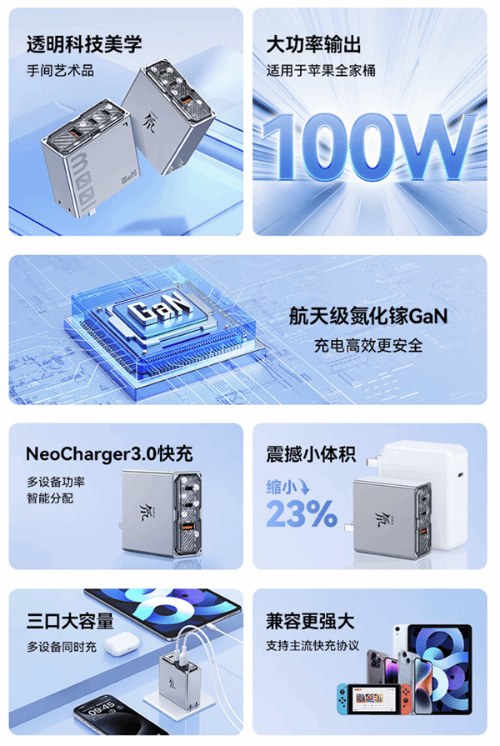 其采用全新升级设计,精心打磨金属质感,透过外壳内部元器件清晰入目。据介绍,这款充电头采用氮化镓技术,使充电器体积更小、重量更轻、充电更快、温控更好、低耗更安全。