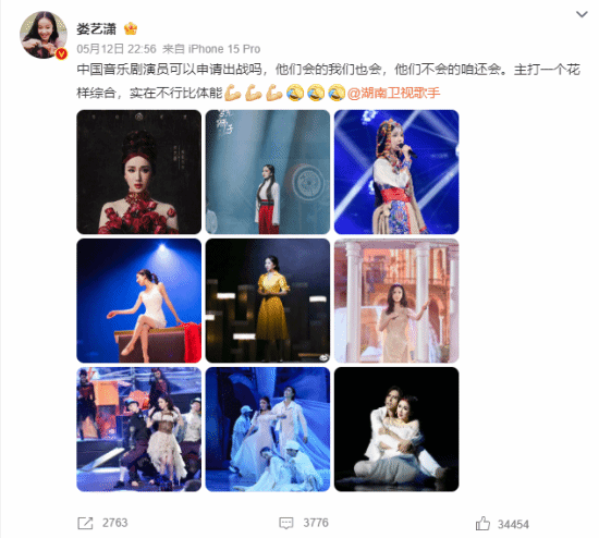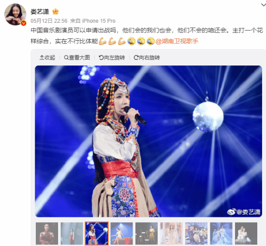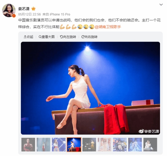 今日,话题“娄艺潇自荐歌手”登顶微博热搜,其在微博表示:中国音乐剧演员可以申请出战吗,他们会的我们也会,他们不会的咱还会。主打一个花样综合,实在不行比体能。