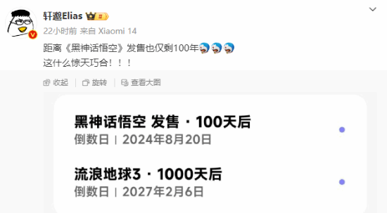 《黑神话:悟空》将于8月20日正式发售,日前,电影博主@轩邈Elias发现,《黑神话:悟空》发售倒计时为100天,而《流浪地球3》的上映倒数日为1000天(2027年2月6日)。两者都是备受期待的国产作品,它们之间出现了惊人的巧合。
