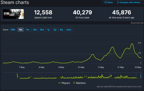 在SteamDB统计网站中可以看到,过去24小时中的玩家峰值数量达到了40279人,而在上月仅为9000余人。相比之下,《消逝的光芒》的最新作——《消逝的光芒2》过去24小时中的玩家峰值仅为7000余人。