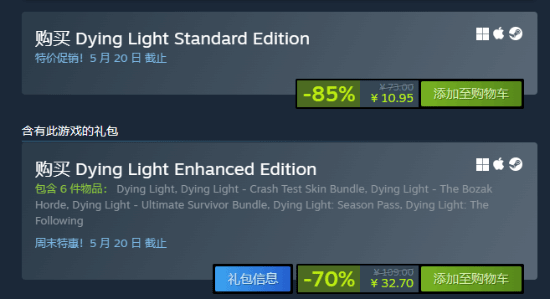 目前,《消逝的光芒》在国区中也进行了特价促销活动,标准版仅需10.95元即可入手,增强版为32.7元,截止至5月20日,感兴趣的玩家可以点击下方链接查看。
