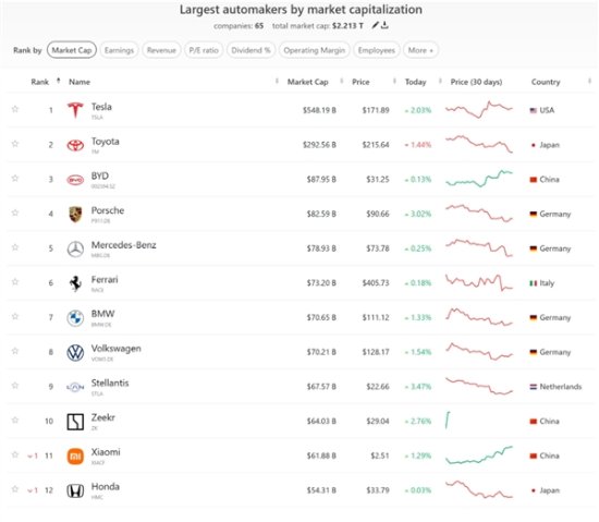 根据companiesmarketcap(公司市值)最新数据,小米成为全球第十一大车企,超过本田。前十名分别为特斯拉、丰田、比亚迪、保时捷、奔驰、法拉利、宝马、大众、Stellantis(斯特兰蒂斯)、极氪。