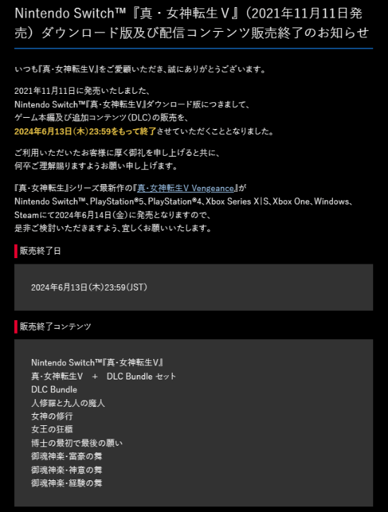 近日,开发商Atlus在官网中发布公告,宣布2021年发售的Switch版本《真女神转生5》及其DLC将于6月13日23:59停止销售,届时会被下月发售的《真女神转生5:复仇》代替,已购买《真女神转生5》的玩家在游戏停售之后仍可以正常下载游玩。