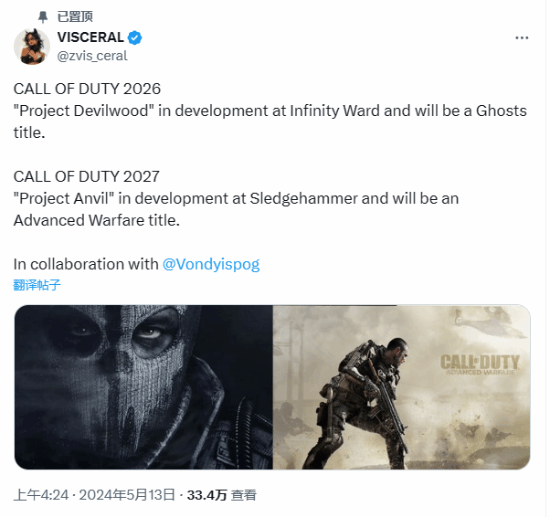 据VISCERAL爆料称,2026年的《使命召唤》代号为“Project Devilwood”,将由Infinity Ward开发,《幽灵》系列作品。