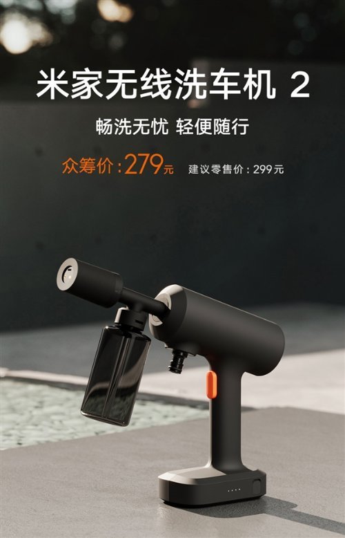 今日,米家无线洗车机2在小米商城、小米有品上架,众筹价279元,将于5月15日开始众筹。