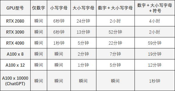 对于MD5加密的纯数字密码,这些GPU都可以瞬间破解,只有小写字母的话A100马上就能搞定,RTX 4090显卡也只需要1秒钟;大小写字母混合、数字加大小写字母会安全一些,不过即便是测试中成绩最差的RTX 2080显卡也能在2个小时内搞定;对于最复杂的数字+大小写字母+符号,RTX 4090也是只需59分钟就能破解。