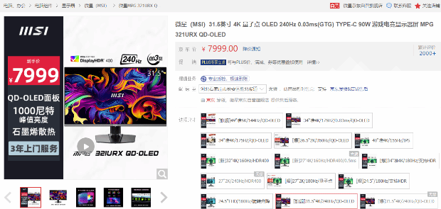 微星MPG 321URX QD-OLED电竞显示器的当前售价为7999元。