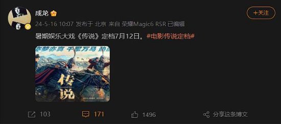 成龙大哥官宣,暑期娱乐大戏《传说》定档7月12日。