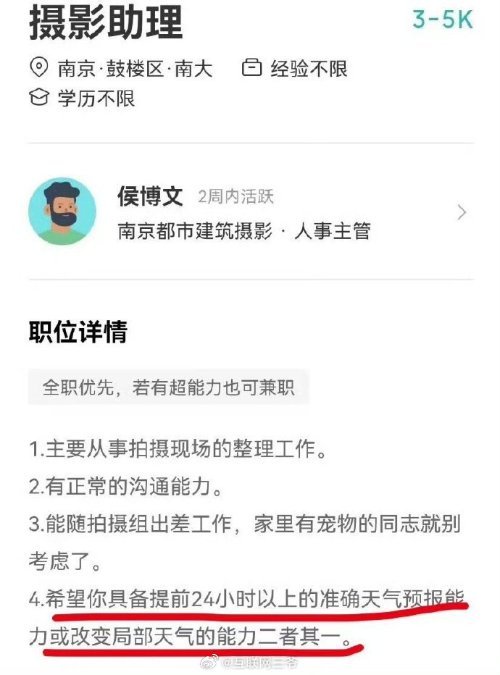 南京一摄影公司招助理引热议:要求能改变局部天气