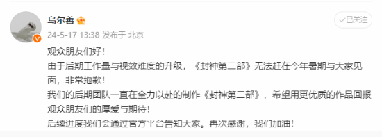 “由于后期工作量与视效难度的升级,《封神第二部》无法赶在今年暑期与大家见面,非常抱歉!”