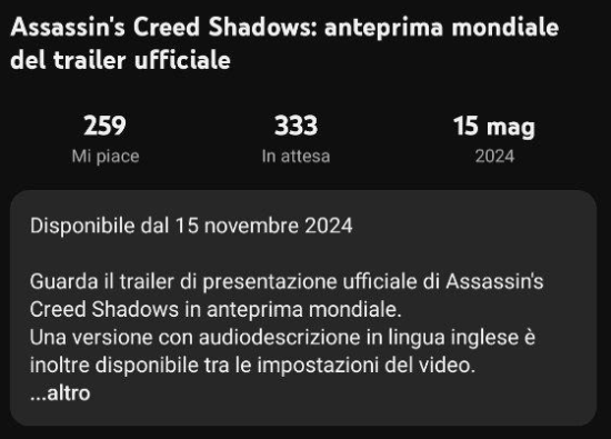 据悉在官宣之后,育碧在预告视频倒计时介绍中,意外透露游戏的发售日为2024年11月15日,后经编辑删除了该信息。