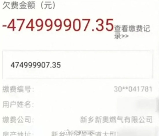 据澎湃质量观报道,近日,河南新乡一商户李先生反映称,查询商铺燃气费时显示欠费近5亿元。