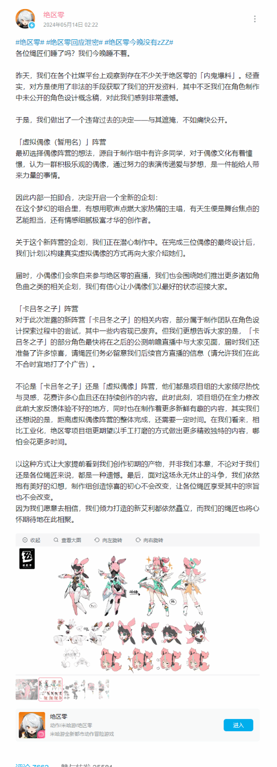 以这种方式让大家提前看到我们创作初期的产物,并非我们本意,不论对于我们还是各位绳匠来说,都是一种遗憾。最后,面对这场永无休止的斗争,我们依然抱有美好的幻想,制作组创造惊喜的初心不会改变,让各位绳匠享受其中的宗旨也不会改变。
