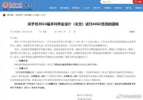 4月10日,湖北大学本科生院发布通知,宣布在本科毕业学生毕业论文审核过程中试行加入对文章使用生成式AI风险情况的检测,如发现该论文检测结果为“AI代写高风险”,教师应指导学生进行修改。此外,一些学校提出学生应在毕业论文中主动披露人工智能使用情况、提醒学生规范合理应用。