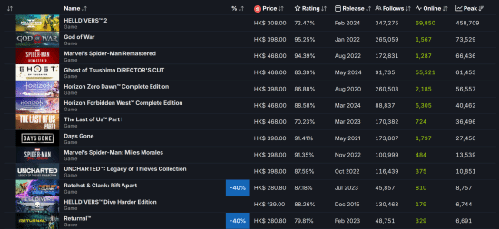 由Arrowhead开发的《地狱潜者2》以 458,709 名同时在线玩家位居榜首,领先于《战神》(2018)的 73,529 名玩家和《漫威蜘蛛侠重制版》的 66,436 名玩家。