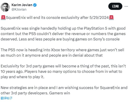 在油管拥有200多万粉丝的博主/媒体编辑Karim Jovian对此发表观点:“SquareEnix以一己之力撑起了PS5,但PS5无法提供游戏应得的收入和销量。在索尼游戏机上购买游戏的人越来越少”“PS5现在正在陷入Xbox一样的境地,游戏在PS5上的销量已经大不如前,而人们却对此矢口否认。”