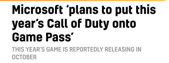 文章中写道:“微软计划对其电子游戏销售策略进行重大调整:转变为在其订阅服务中发布《使命召唤》的最新版本,而不是长期以来的利润丰厚的单点销售方式。”