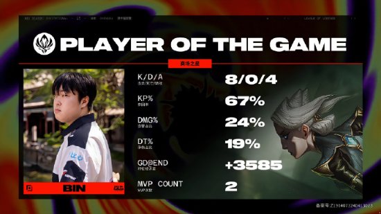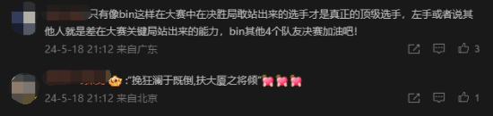 BLG上单选手BIN整场比赛两获MVP,其出色发挥在这场BO5中起到关键作用,赛后“神bin天降”话题登上微博热搜,不少网友称赞其状态火热,并希望可以延续到最终决赛上。