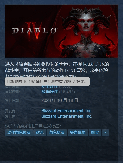 《暗黑破坏神4》的第四赛季已经于本周早些时候上线,而自从5月15日以来,《暗黑4》的Steam在线玩家数就大幅度提升。24小时在线峰值为28364人。游戏的Steam好评率也升至70%,为多半好评。